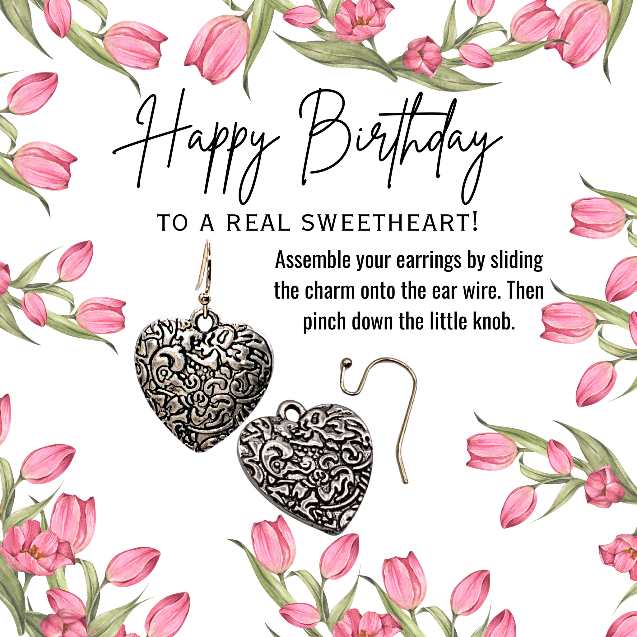 These sweetheart silver toned earrings are imprinted with a darling scroll design. They will mail flat in a regular envelope with a regular stamp. Includes “how to assemble” instruction note. Total length 1 3/8”.