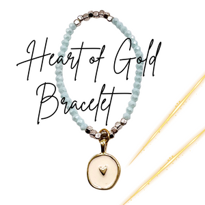 Stunning white enamel Freeform shape with Golden Heart in the center and beautiful golden rim, adorns this soft blue stretch bead bracelet.